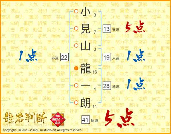 小(3画)見(7画)山(3画) 龍(16画)一(1画)朗(11画)