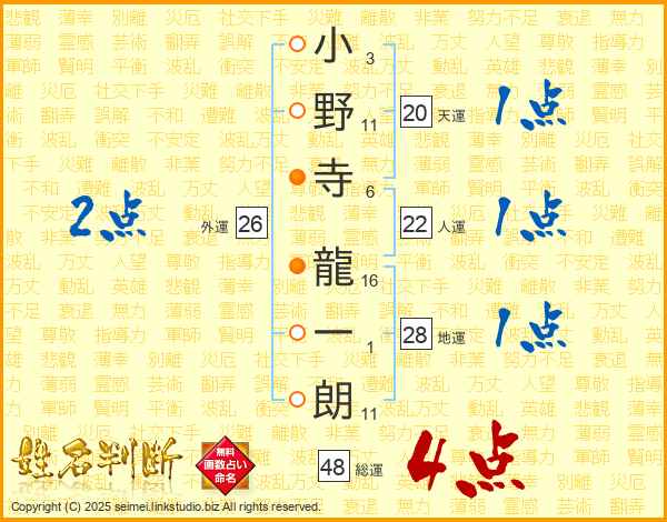 小(3画)野(11画)寺(6画) 龍(16画)一(1画)朗(11画)
