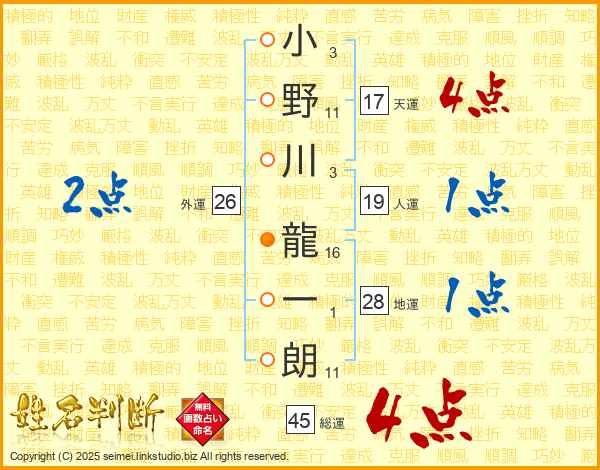 小(3画)野(11画)川(3画) 龍(16画)一(1画)朗(11画)