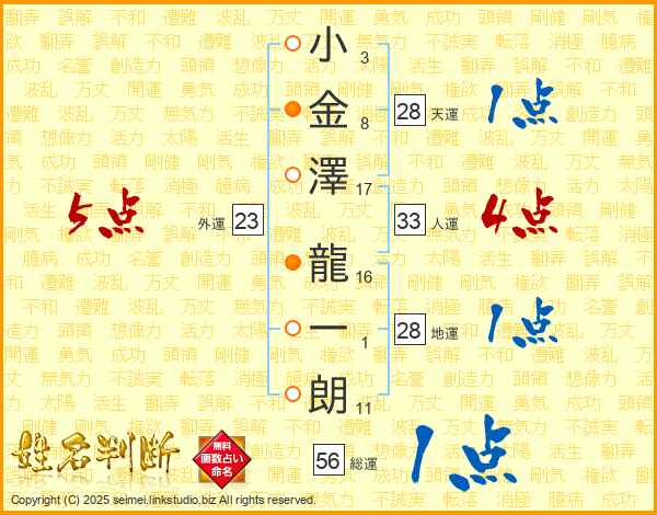 小(3画)金(8画)澤(17画) 龍(16画)一(1画)朗(11画)