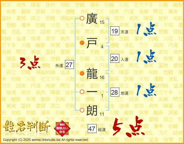 廣(15画)戸(4画) 龍(16画)一(1画)朗(11画)