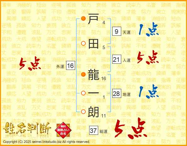 戸(4画)田(5画) 龍(16画)一(1画)朗(11画)