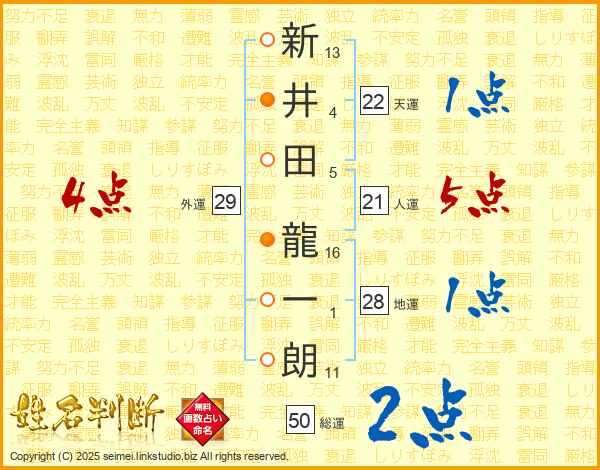新(13画)井(4画)田(5画) 龍(16画)一(1画)朗(11画)