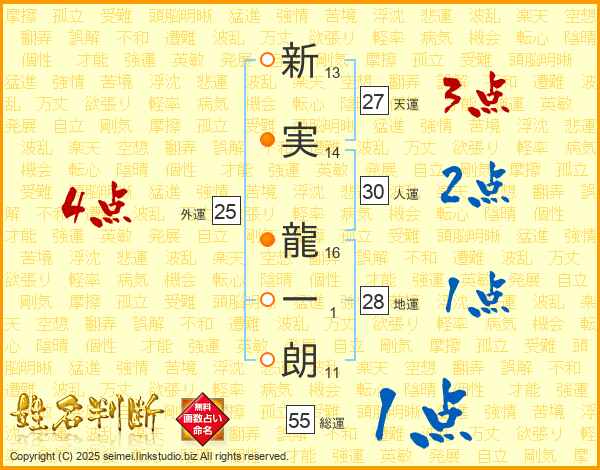 新(13画)実(14画) 龍(16画)一(1画)朗(11画)