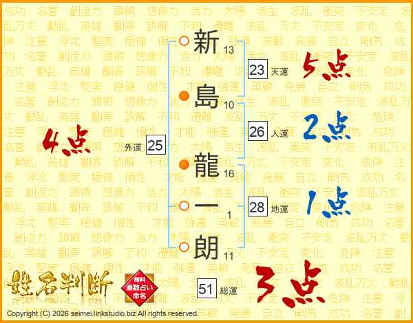 新(13画)島(10画) 龍(16画)一(1画)朗(11画)