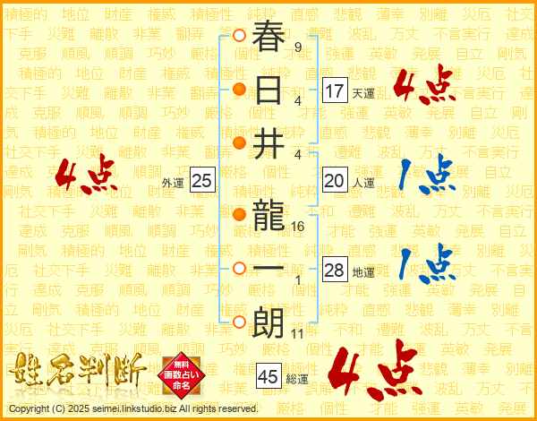 春日井龍一朗さんの総運は45画の4点!