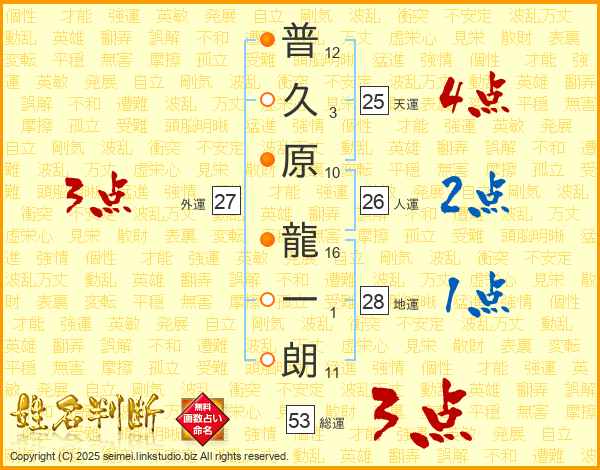 普(12画)久(3画)原(10画) 龍(16画)一(1画)朗(11画)