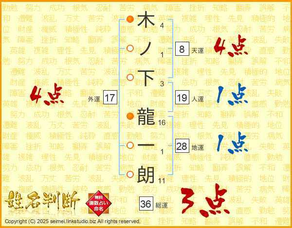 木(4画)ノ(1画)下(3画) 龍(16画)一(1画)朗(11画)