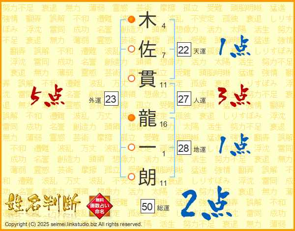 木(4画)佐(7画)貫(11画) 龍(16画)一(1画)朗(11画)