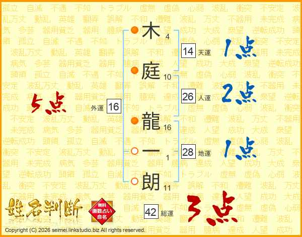 木(4画)庭(10画) 龍(16画)一(1画)朗(11画)