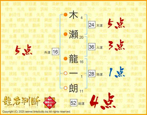 木瀬龍一朗さんの総運は52画の4点!