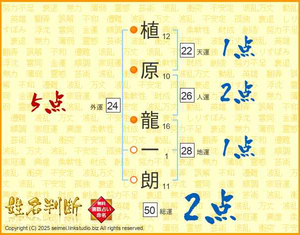 植(12画)原(10画) 龍(16画)一(1画)朗(11画)