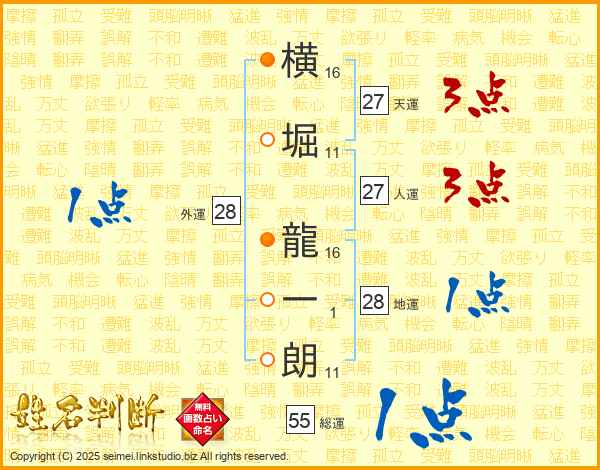 横(16画)堀(11画) 龍(16画)一(1画)朗(11画)