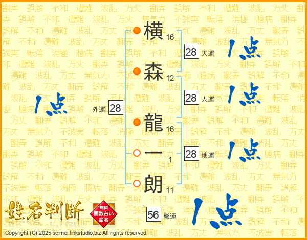 横(16画)森(12画) 龍(16画)一(1画)朗(11画)