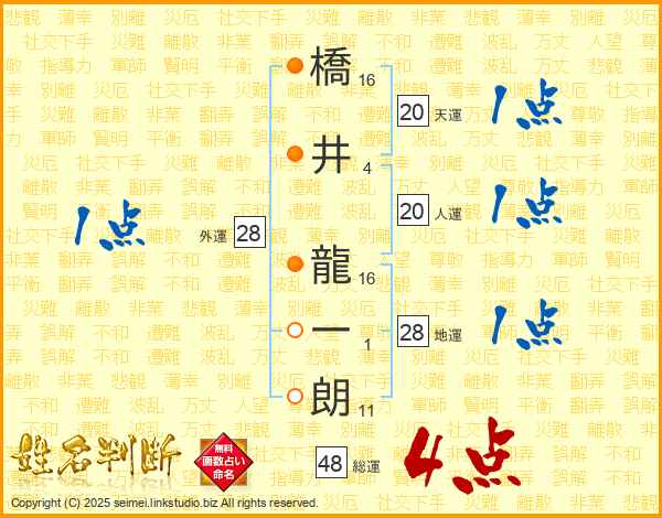 橋(16画)井(4画) 龍(16画)一(1画)朗(11画)