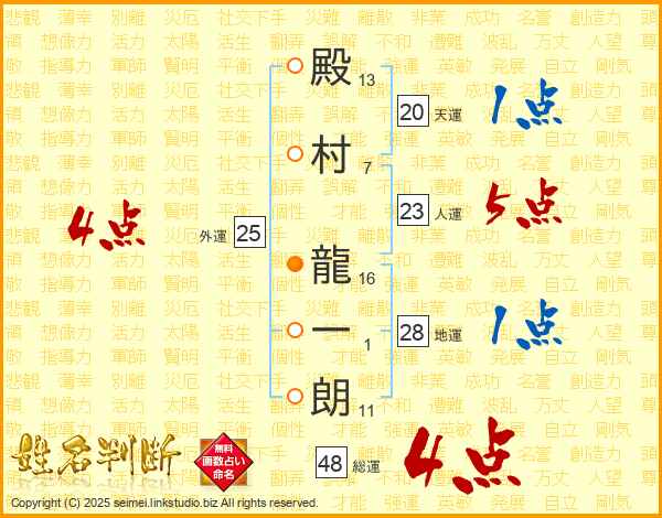 殿(13画)村(7画) 龍(16画)一(1画)朗(11画)