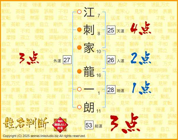 江(7画)刺(8画)家(10画) 龍(16画)一(1画)朗(11画)