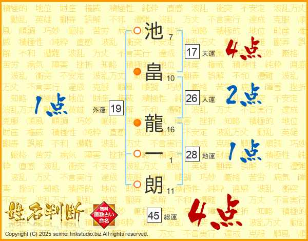 池(7画)畠(10画) 龍(16画)一(1画)朗(11画)