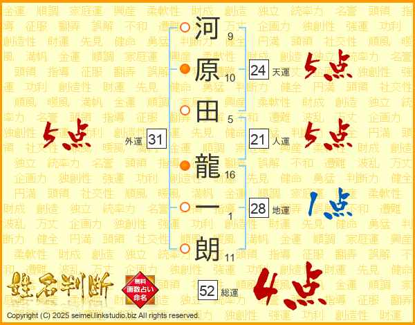 河(9画)原(10画)田(5画) 龍(16画)一(1画)朗(11画)