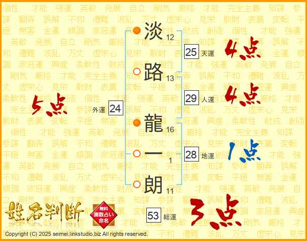 淡(12画)路(13画) 龍(16画)一(1画)朗(11画)