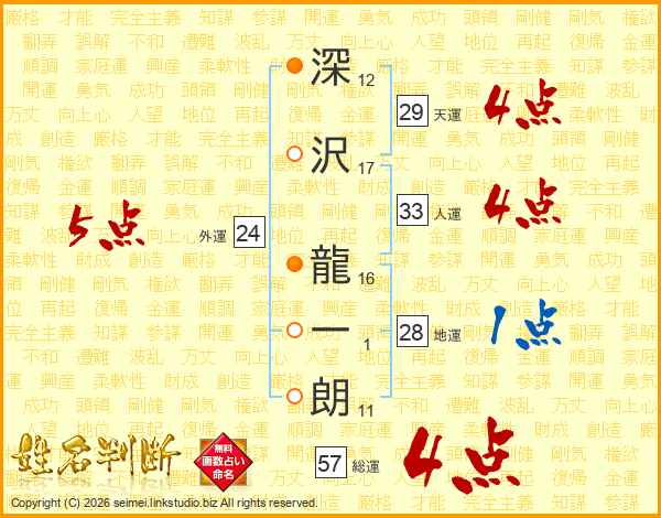 深(12画)沢(17画) 龍(16画)一(1画)朗(11画)
