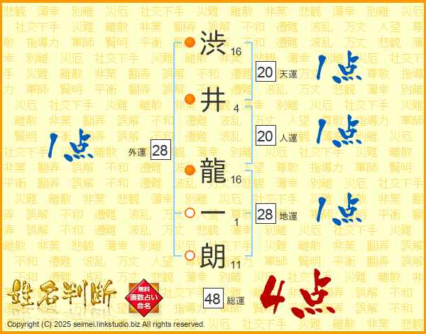 渋(16画)井(4画) 龍(16画)一(1画)朗(11画)
