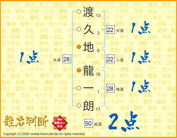渡(13画)久(3画)地(6画) 龍(16画)一(1画)朗(11画)
