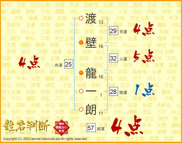渡(13画)壁(16画) 龍(16画)一(1画)朗(11画)