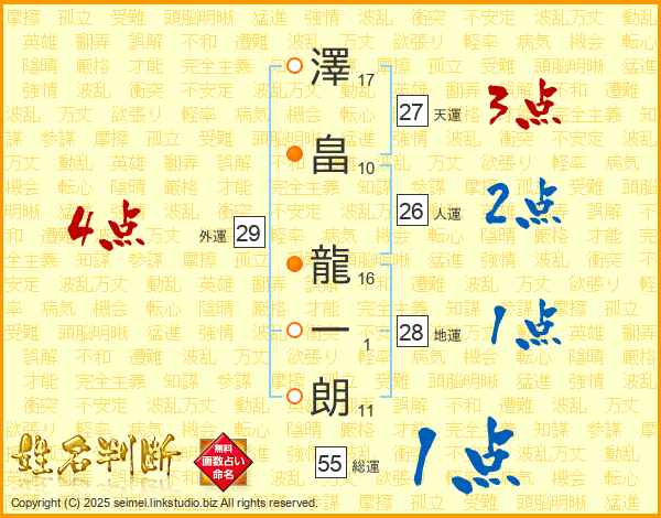 澤(17画)畠(10画) 龍(16画)一(1画)朗(11画)