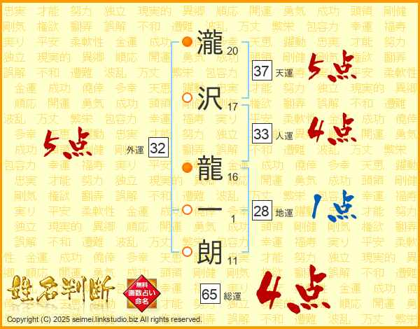 瀧(20画)沢(17画) 龍(16画)一(1画)朗(11画)