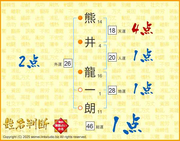 熊(14画)井(4画) 龍(16画)一(1画)朗(11画)
