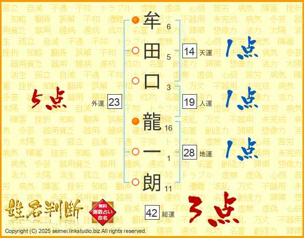牟(6画)田(5画)口(3画) 龍(16画)一(1画)朗(11画)