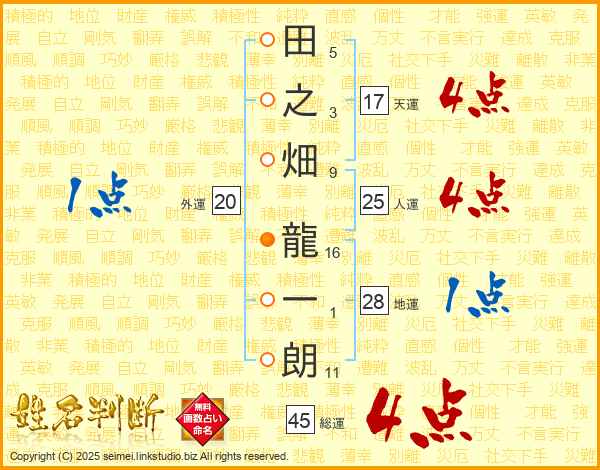 田(5画)之(3画)畑(9画) 龍(16画)一(1画)朗(11画)