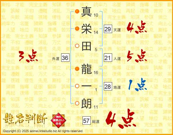 真(10画)栄(14画)田(5画) 龍(16画)一(1画)朗(11画)