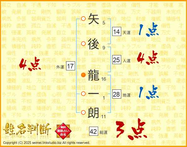 矢(5画)後(9画) 龍(16画)一(1画)朗(11画)