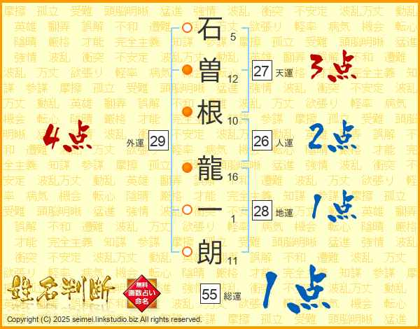 石(5画)曽(12画)根(10画) 龍(16画)一(1画)朗(11画)