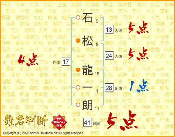 石(5画)松(8画) 龍(16画)一(1画)朗(11画)