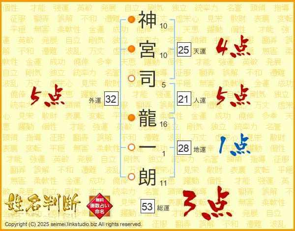 神(10画)宮(10画)司(5画) 龍(16画)一(1画)朗(11画)