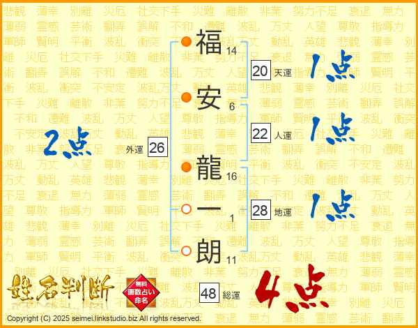 福(14画)安(6画) 龍(16画)一(1画)朗(11画)