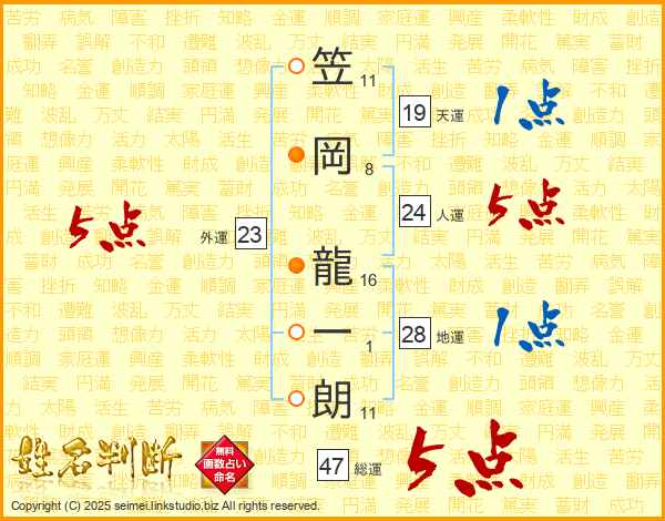 笠(11画)岡(8画) 龍(16画)一(1画)朗(11画)