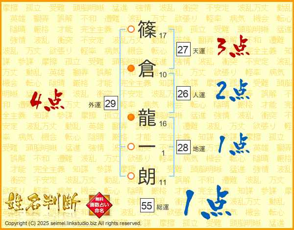 篠(17画)倉(10画) 龍(16画)一(1画)朗(11画)