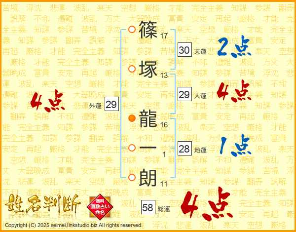 篠(17画)塚(13画) 龍(16画)一(1画)朗(11画)