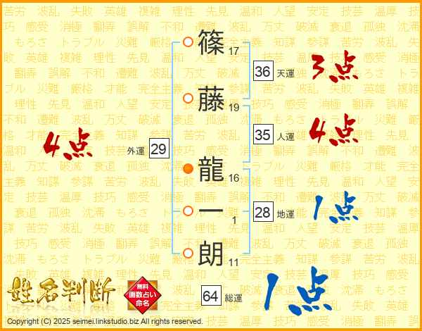 篠(17画)藤(19画) 龍(16画)一(1画)朗(11画)