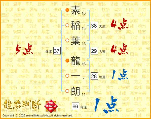 素(10画)稲(15画)葉(13画) 龍(16画)一(1画)朗(11画)
