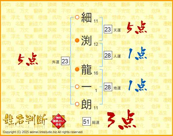 細(11画)渕(12画) 龍(16画)一(1画)朗(11画)