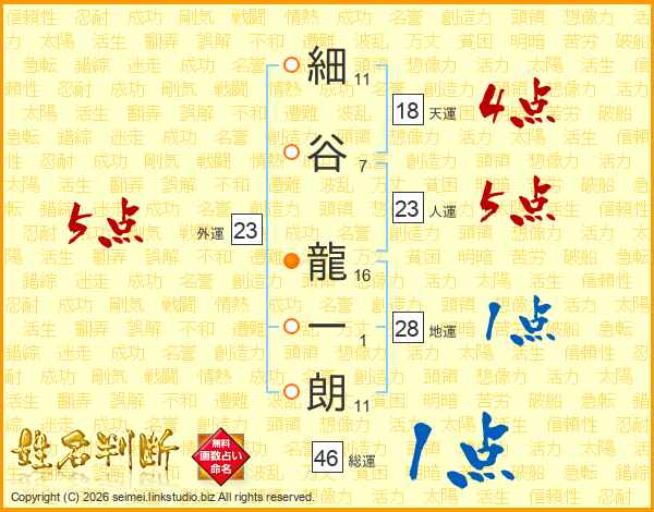 細(11画)谷(7画) 龍(16画)一(1画)朗(11画)