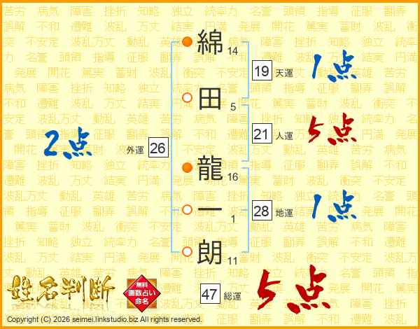 綿(14画)田(5画) 龍(16画)一(1画)朗(11画)
