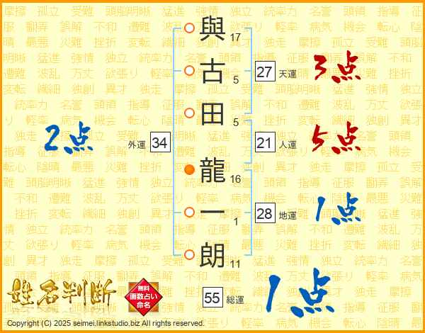 與(17画)古(5画)田(5画) 龍(16画)一(1画)朗(11画)