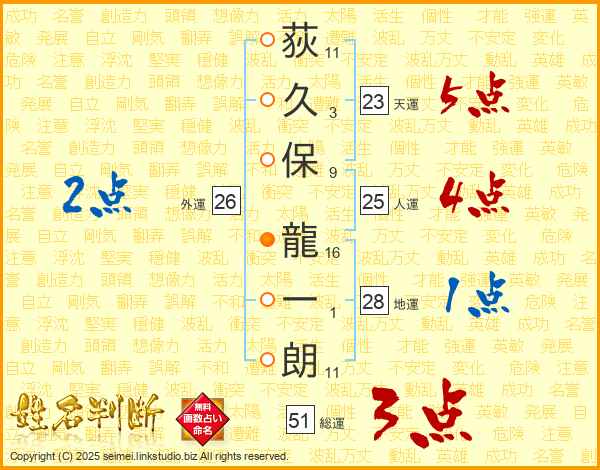 荻(11画)久(3画)保(9画) 龍(16画)一(1画)朗(11画)