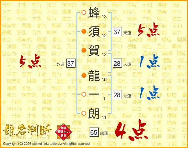 蜂須賀龍一朗さんの天運は37画の5点!